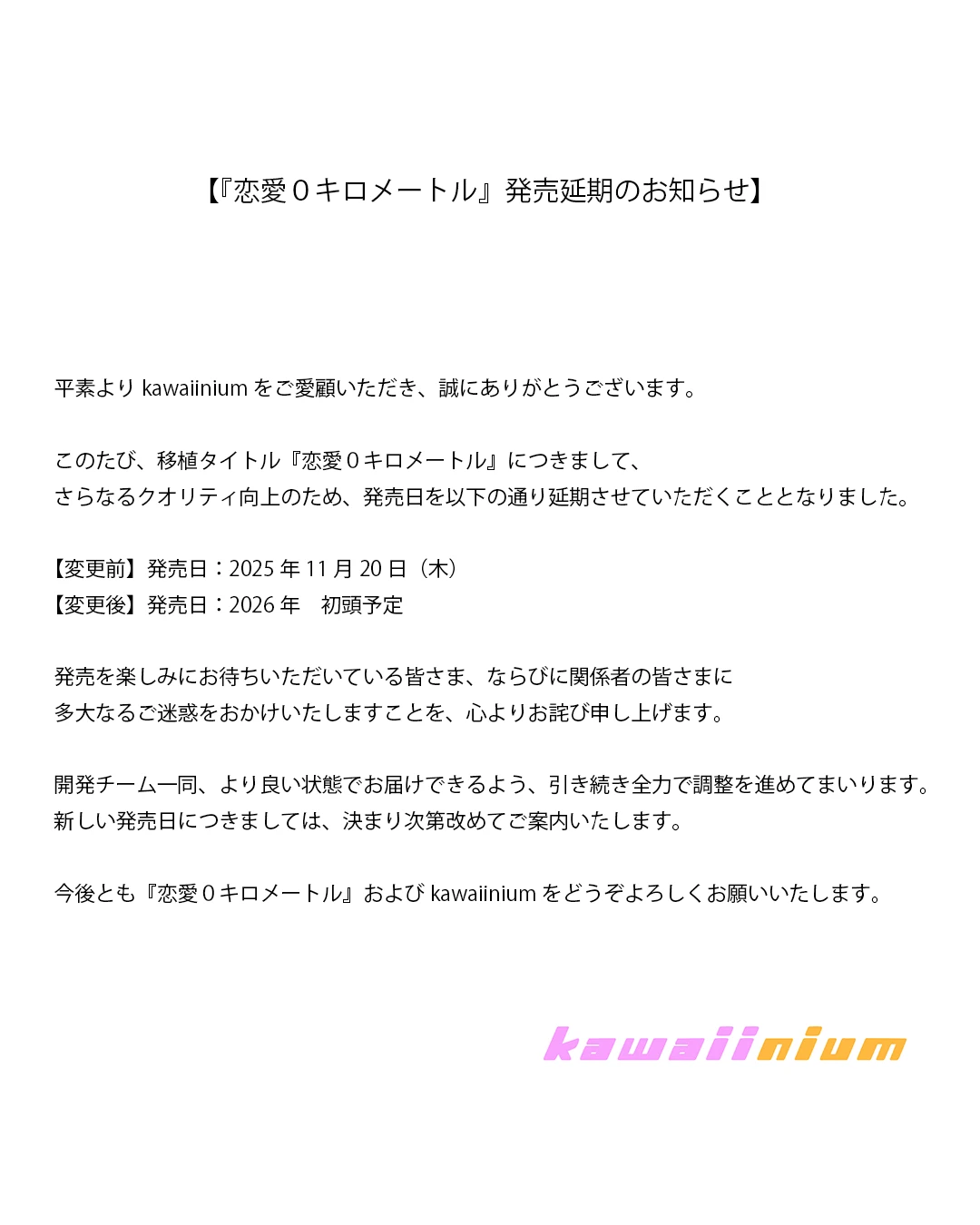 本周,Kawaiinium 宣布原定于 2025 年 11 月 20 日发售的《恋爱0公里》Steam 版将跳票至 2026 初。本作原版是 ASa Project 于 2011 年 10 月发售的 Galgame,由天都、廣瀬一貴、十全负责剧本,柊暁生、ぱん太、夕凪セシナ负责原画。本作有着 ASa Project 一贯的无厘头搞笑风格,讲述了男主角因为有着四个儿子的家里想要女儿而交换到有着类似想法的四位女主角的家里,并与四姐妹展开的一系列故事。感兴趣的玩家可以前往 Steam 商店页面将本作加入愿望单。